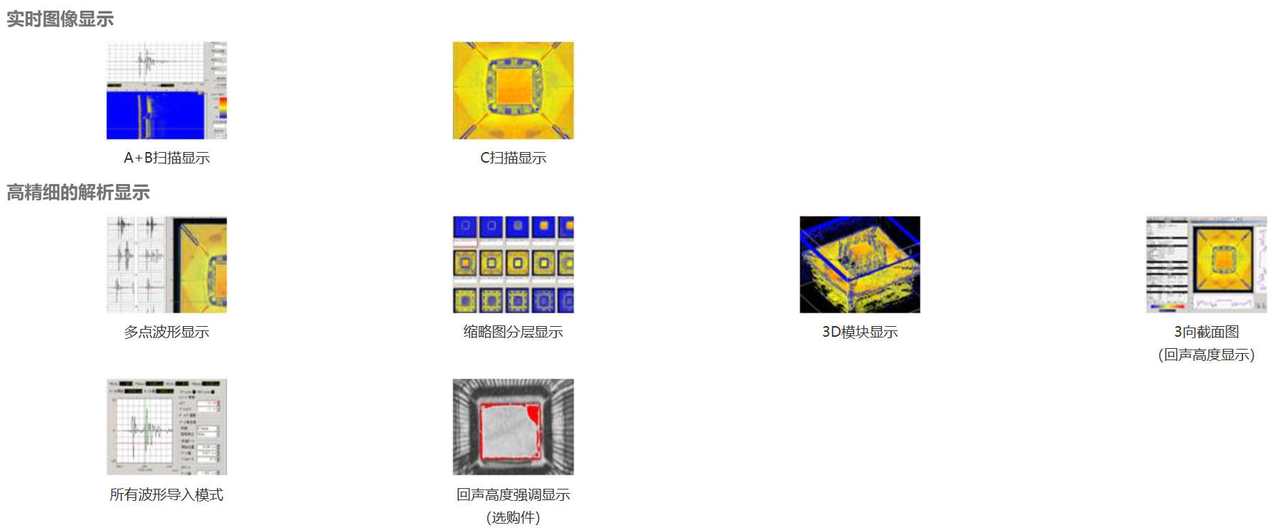 A,B,C扫描图像显示、 面积率、 任意A扫描显示等 |